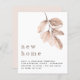 Budget Blush Leaves Moving New Home Details. A budget friendly SMALLER 4.5” x 5.6” alternative. Available in a SEMI GLOSS 110 lb CARD STOCK or a SATIN FINISH 80 lb THINNER PAPER STOCK. Envelopes are an optional extra. The header is large in stylish lowercase with the details beneath. Blush leaves flow down from the top right. Easily personalise the text to your own details and replace the sample photo on the back with your own picture of your new home.