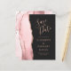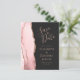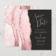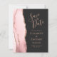 The left-hand edge of this elegant modern wedding save the date card features a blush pink watercolor agate border trimmed with faux rose gold glitter. The customizable text combines rose pink handwriting, copperplate and italic fonts on a slate black background. The reverse side features a matching blush and rose gold agate design.