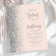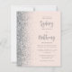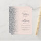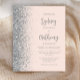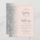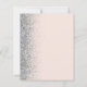 The left-hand edge of this elegant modern wedding invitation features a silver faux glitter border. The customisable text combines grey calligraphy script and sans serif font on a blush pink background. The reverse side features a matching blush and silver design.
