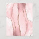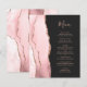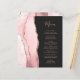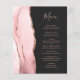 The left-hand edge of this elegant modern wedding invitation features a blush pink watercolor agate border trimmed with faux rose gold glitter. The customizable text combines rose pink handwriting script and copperplate fonts on an off-black background. The reverse side features a matching blush pink and rose gold agate design.
