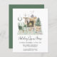 Budget boho-inspired holiday open house invitation featuring a watercolor illustration of a cosy sage green home interior and fireplace decorated for Christmas with a wreath, reindeer, a Christmas tree, candles and gnomes.