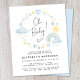 Cute and whimsical budget-friendly baby boy shower invitation featuring boho-inspired pastel blue and yellow watercolors of a rainbow, sun, hearts, stars, moons and clouds and "Oh Baby!" in a stylish calligraphy script.