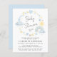 Budget-friendly whimsical boho baby boy shower invitation featuring pastel blue and yellow watercolors of a rainbow, sun, hearts, stars, moons and clouds.
