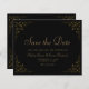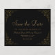 This elegant vintage-inspired formal wedding save the date card features the text in gold coloured script and serif fonts, framed by a delicate vintage gold vine motif on a black background. The frame is repeated on the reverse.