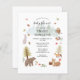Simply create a cute woodland animals baby shower invitation with this template featuring an owl, fox, bear, squirrel, deer, mushrooms and more for your cottage core theme shower for the mum-to-be.