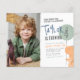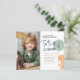A budget-friendly birthday party invitation featuring a hand-drawn dinosaur holding a balloon. Inside the balloon is the birthday boy's age. The invite text is rotated and aligned to the left for a fun layout. The top of the invite reads "Stomp, chomp & roar. Let's party like a dinosaur!". Below, your little one's name is written in a handwriting-style font. The party information is written at the bottom with extra space for a custom message. On the left-hand side of the card, there is a photo of your choice. Dividing the photo and the design, there is a brushed white line. Cards reverse to a pattern of organic shapes against a blue background. The colour palette of this design is blue, orange, and green. Perfect for any age child! Colourful dinosaur-themed birthday invitations. A standard invitation version of this design is available in my store. Please note, as this is on Zazzle's budget paper option, we only recommend the semi-gloss finish. Feel free to message me with any questions - I'll be happy to help!