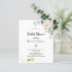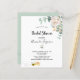 An invitation for a bride to bee. A chic white background. Decorated with white watercolored florals flowers (peony) eucalyptus greenery, leaves and sprigs, and a cute happy smiling bee carrying an envelope. Personalise and add a name and party details. Black letters. The text: Bridal Shower and the name of the bride to bee are written with a modern hand lettered style script.