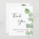 A thank you card for a Bridal Shower. A chic white background decorated with eucalyptus greenery. On front large black coloured hand lettered script and the text: Thank You, your and a date. Back: Personalise and add Your thank you note and name.