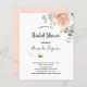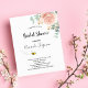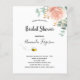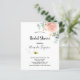 An invitation for a bride to bee. A chic white background. Decorated with a rose gold, blush pink watercolored floral flower (rose) eucalyptus greenery, leaves and sprigs, and a cute happy smiling bumble bee. Personalise and add a name and party details. Black letters. The text: Bridal Shower and the name of the bride to bee are written with a modern hand lettered style script.