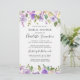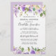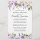 Very pretty combination of dark purple roses, light purple roses and ivory white flowers. They are all are tucked into a variety of green leaves. Together they create floral borders along the top and bottom of this bridal shower invitation. The bride's name is written in a large script font.