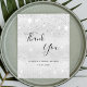 A Bridal Shower thank you card. A faux silver metallic looking background color. With faux glitter dust. On front, a large hand lettered script and the text: Thank You, your text, title and a date.