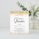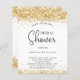 A stylish white background. Decorated with faux gold glitter dust. Personalise and add a name and party details. The name is written with a hand lettered style script