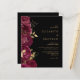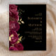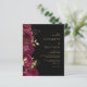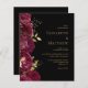 This romantic floral wedding invitation features a border of burgundy flowers set off with gold faux foil foliage. The names of the couple appear in classic gold-coloured serif font, with the remaining text in italics, on a black background.
