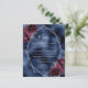This elegant modern wedding menu features a silver geometric frame decorated with burgundy and silver floral bouquets on a navy blue faux foil background. The customisable text combines silver grey whimsical handwriting, copperplate and italic fonts.