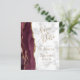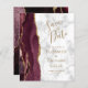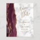 The left-hand edge of this elegant modern wedding invitation features a burgundy watercolor agate border trimmed with faux gold glitter. The customisable text combines gold coloured handwriting script with copperplate and italic fonts on a grey and white marble background. The reverse side features a matching burgundy and gold agate design.