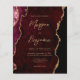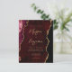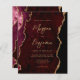 This elegant wedding invitation features a background image of burgundy watercolor agate trimmed with faux gold glitter. The customisable text combines gold-coloured modern handwriting, copperplate and italic fonts. The reverse side provides space for wedding details on a matching burgundy agate background, along with a QR code guests can scan to visit your website and RSVP, which saves the cost of printing and mailing separate RSVP cards.