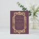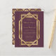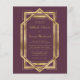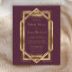 This elegant vintage-inspired wedding invitation features gold-coloured text on a burgundy red background, framed by a geometric vintage art deco design. A coordinating gold and burgundy art deco fan pattern decorates the back of the card.