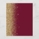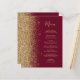 The left-hand edge of this elegant modern wedding menu features a gold faux glitter border. The customisable text combines gold-coloured whimsical handwriting script and copperplate fonts on a burgundy red background. The reverse side features a matching burgundy and gold glitter design.