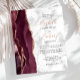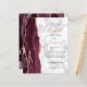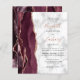The left-hand edge of this elegant modern wedding invitation features a burgundy red watercolor agate border trimmed with faux rose gold glitter. The customisable text combines dusty rose handwriting with black copperplate and italic fonts on a grey and white marble background. The reverse side features a matching burgundy and rose gold agate design.