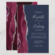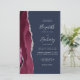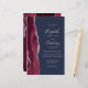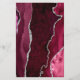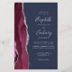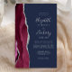 The left-hand edge of this elegant modern wedding invitation features a burgundy watercolor agate border trimmed with silver faux glitter. The customizable text combines silver gray handwriting, copperplate and italic fonts on a navy blue background. The back features a matching burgundy and silver agate design.