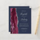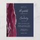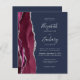 The left-hand edge of this elegant modern wedding invitation features a burgundy watercolor agate border trimmed with silver faux glitter. The customisable text combines silver grey handwriting, copperplate and italic fonts on a navy blue background. Add additional details on the back, along with a QR code to help your guests visit your wedding website.