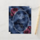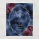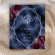 This elegant modern wedding save the date card features a silver geometric frame decorated with burgundy and silver floral bouquets on a navy blue faux foil background. The customisable text combines silver grey whimsical handwriting, copperplate and italic fonts.