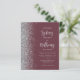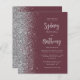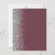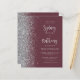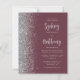 The left-hand edge of this elegant modern wedding invitation features a silver faux glitter border. The customisable text combines pale silver grey calligraphy script and sans serif font on a dark burgundy background. The reverse side features a matching burgundy and silver design.