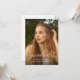 This graduation announcement features a large, full front photo with calligraphy script overlay and a second photo on the back along with your graduation party invitation. The back elements can be removed by clicking the button to edit further.