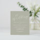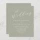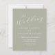This simple modern wedding invitation features white text on a sage green background. The words "The Wedding" appear in stylish calligraphy script. Add the couple's names in seri font and the remaining text in sans serif. The reverse side is solid sage green.