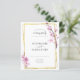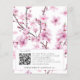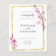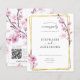 Budget Cherry Blossom and Gold Frame QR Code Wedding Evening Party Invitation. The font colour and type can be changed via the edit menu. You can also change text and background colours on either side if you wish. A value for money smaller 4.5 x 5.6 inch alternative defaulted to the semi gloss option which is recommended for invitations and is a similar thickness to a postcard. The satin option is much thinner. Add your QR code to your wedding website on the back as a convenient option for your guests to RSVP. QR codes can be created free online. Simply search “QR code creator” and select one of the free creators. You can also remove the QR code should you wish.