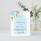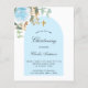 A white background decorated with eucalyptus greenery, a light blue rose, and golden leaves and a blue arch frame. Personalise and the childs name and ceremony details. Elegant hand lettered style script.