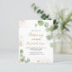 A white background decorated with eucalyptus greenery and faux gold glitter dust. Personalise and the childs name and ceremony details. Black and golden coloured letters. Gender neutral.