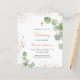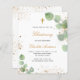 A white background decorated with eucalyptus greenery and faux gold glitter dust. Personalise and the childs name and ceremony details. Black and golden coloured letters. Gender neutral.