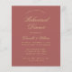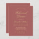 A simple rehearsal dinner invitation with a modern colour: cinnamon rose. It has just golden yellow text on cinnamon rose background. The words "Rehearsal Dinner" and the name are written in an elegant calligraphic script.