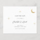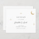 A minimalist modern celestial wedding invitation features a simple and elegant design. It includes a gold foil moon and stars that gently sparkle, set against a clean background. The invitation uses classic serif typography, which adds a traditional and formal touch with its neat and clear style.