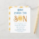Invite family and friends to your sun-themed baby shower with this budget boys' baby shower invitation. It features the text "Here Comes The Son" in blue retro typography with a cute yellow watercolor sun. The back is decorated with a smiling sun pattern. Easily customisable. Original Watercolor © Michele Davies.