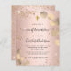 A blush, rose gold background decorated with eucalyptus greenery and faux glitter dust. Personalise and a name and ceremony details. Black coloured letters.