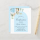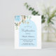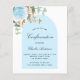 A white background decorated with eucalyptus greenery, a light blue rose, and golden leaves and a blue arch frame. Personalise and a name and ceremony details. Elegant hand lettered style script.