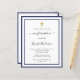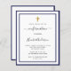 A modern, elegant and confirmation invitation. A white background decorated with navy blue frames and a golden cross. Personalise and add a name and details. Black coloured letters.