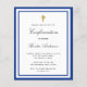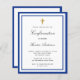 A modern, elegant and confirmation invitation. A white background decorated with royal blue frames and a golden cross. Personalize and add a name and details. Black colored letters, elegant hand lettered style script.