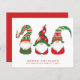 Simple budget-friendly holiday card featuring three cute Scandinavian gnomes with seasonal red and green hats and tunics. You can personalise a "Happy Holidays, "Merry Christmas," etc., greeting and your name and the year in coordinating red typography.