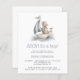 This cute baby shower invitation features a dusty blue and beige watercolor illustration of a teddy bear riding in a sailboat. The words "AHOY! It's a Boy!" and the name of the mom-to-be appear in dusty blue decorative font. Ideal for a nautical-themed boy's baby shower.