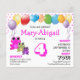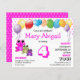 Budget cute pink girly birthday party invitation, showing a trio of vibrant wide-eyed frogs and an array of colourful balloons. On the front, you can customise the child's name and age, plus the date, rsvp details and venue. The background includes a pretty tiled pattern which is linked to the main age, and this is repeated on the reverse. All you need to do is to change the number once, and it will automatically change the pattern. (These are good quality budget invitations, so please remember to add envelopes and/or transfer design to card stock if preferred.) This design is suitable for any age up to 9.