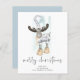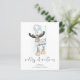Cute Reindeer Script Merry Christmas Card. A budget price SMALLER 4.5” x 5.6” alternative for your festive greetings in a SEMI-GLOSS 110 lb CARD STOCK. The envelopes are slightly larger than the card size. Merry Christmas is in a stylish set script. Easily personalise your name and greeting at the bottom. A coordinating blue is on the back.