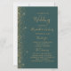 This elegant, modern wedding program features a dark green background edged with gold faux glitter. The text appears in elegant gold-colored handwriting and copperplate fonts.