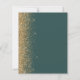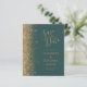 The left-hand edge of this elegant modern wedding save-the-date card features a gold faux glitter border. The customisable text combines gold-coloured handwriting, copperplate and italic fonts on a dark green background. The reverse side features a matching dark green and gold design.