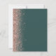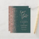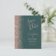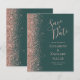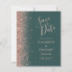 The left-hand edge of this elegant modern wedding save the date card features a rose gold faux glitter border. The customisable text combines pale rose gold blush coloured handwriting, copperplate and italic fonts on a dark green background. The reverse side features a matching dark green and rose gold design.