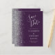 The left-hand edge of this elegant modern wedding save the date card features a silver faux glitter border. The customisable text combines silver grey handwriting, copperplate and italic fonts on a dark purple background. The reverse side features a matching purple and silver design.