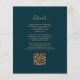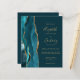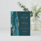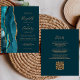 The left-hand edge of this elegant modern wedding invitation features a teal watercolor agate border trimmed with faux gold glitter. The customisable text combines gold coloured handwriting, copperplate and italic fonts on a dark teal background. The reverse side provides space for wedding details on a solid teal background, along with a QR code guests can scan to visit your website and RSVP.
