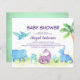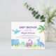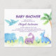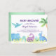 Cute Brachiosaurus, Stegosaurus, Pterodactyls, Dinosaurs that have Tropical Greenery Botanical Watercolor of green, blue, and purple Baby Shower budget friendly Invitations on green background. This invitation includes beautiful and elegant script typography with modern tropical palm trees and greenery for the special Mother to Be celebration.